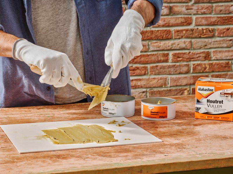 Alabastine Houtrotvuller is een 2 componenten epoxy-massa voor definitieve reparatie van verrot hout. Binnen en buiten te gebruiken, makkelijk te mengen, ijzersterk, vormvast en zeer goed af te werken.
